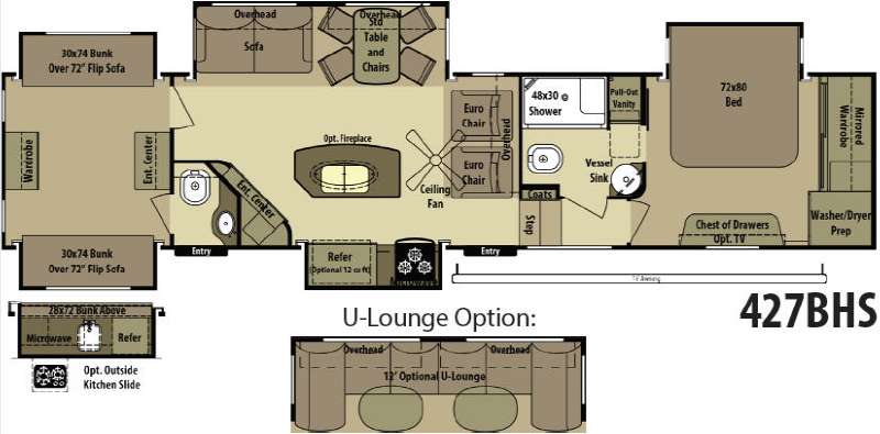 You can also choose to add an optional U-shaped lounge in place of the sofa and dinette slide in the center. Also available is an optional bedroom TV, fireplace, and outdoor kitchen slide featuring a refrigerator, sink, microwave oven, counter area, and two burner cook-top plus more!