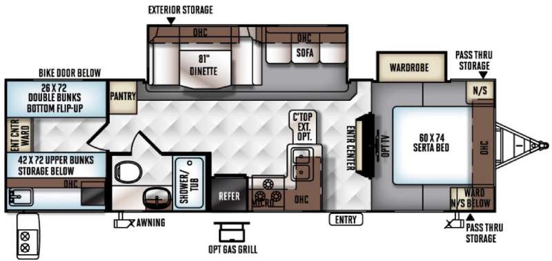 As you enter the private bunk house there is a set of bunk beds to the right with the bottom being a flip up bunk to allow for loading and unloading of your gear through the bike door. On the opposite side is an upper bunk with storage below. Plus there is an entertainment center with a wardrobe in between.