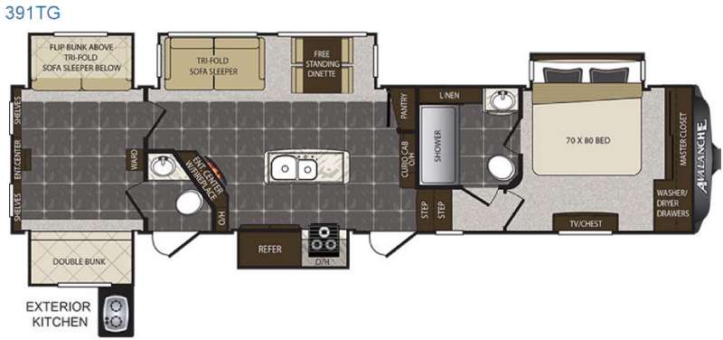 Step inside the Avalanche fifth wheel 391TG by Keystone RV and find yourself if comfort and luxury. Your next camping trip can be so much more fun and enjoyable in this model.