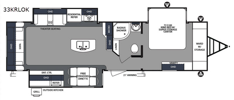 Are you ready for a great time away from home while relaxing in this triple slide out Surveyor 33KRLOK travel trailer? With two kitchens - one inside and one outside, the hardest decision that you will have to make is where you will fix your meals. If you enjoy grilling out then the outside kitchen is sure to be a draw for you. Inside you can relax around the free-standing dinette, the theater seats, or the sofa. Your perishables can be stored in the residential refrigerator and the island has a double sink with a high rise faucet plus extra counter space so you have more room to work. When you are ready to turn in for the night then come enjoy the comfortable king bed and more!
