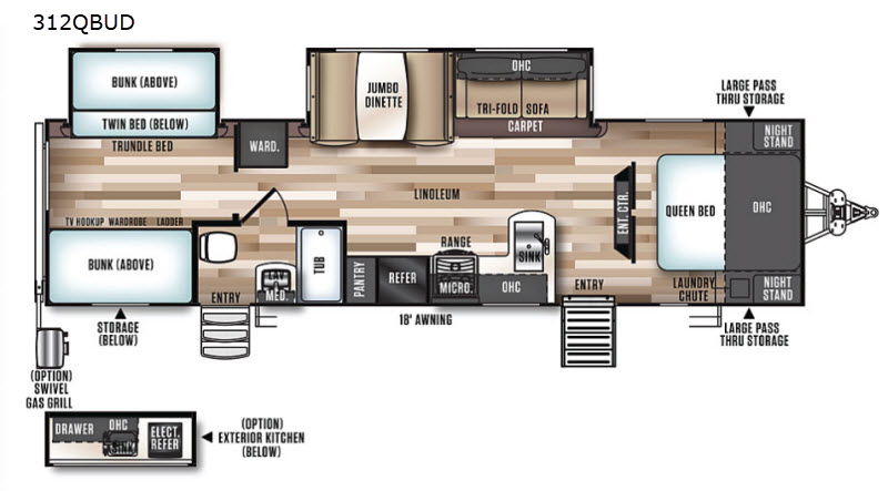 Load up your family of nine and head out to your favorite campground for a relaxing weekend away with this double slide out Wildwood Heritage Glen LTZ 312QBUD travel trailer. With dual entry doors you can either enter and be in the combined kitchen/living area or in the bathroom. Your kids will enjoy their own space with the rear bunkhouse and mom and dad will enjoy the private front bedroom. When you want to spend more time outdoors then come enjoy the 18' awning. With the large pass through storage area you will have plenty of room for all of your extra camping gear. You can even choose to add a few "extras" such as the optional swivel gas grill and the optional exterior kitchen!