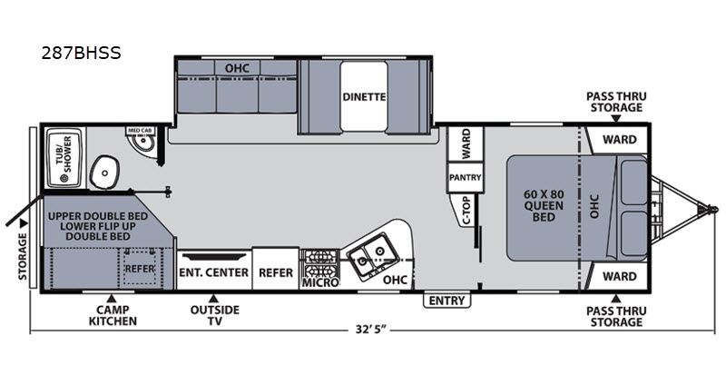 From the camp kitchen and outside TV, to the large slide and rear bath, this travel trailer has it all! Make it a whole family vacation since this unit can sleep up to ten people. The kids will love the double bunk beds and mom and dad will enjoy the queen bed in the front private bedroom. You'll find additional sleeping space on the tri-fold sofa or dinette once folded down for the night. This model features a stainless steel microwave and a three burner range to prepare all your meals while away from home. Make it a movie night with an entertainment center with an LED TV inside, or grab your comfy blanket, cuddle up with the kids, and watch the movie on the outside TV under the power awning with LED Lights.