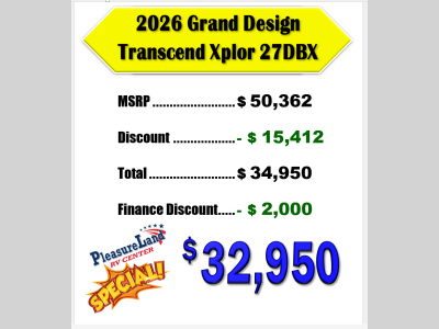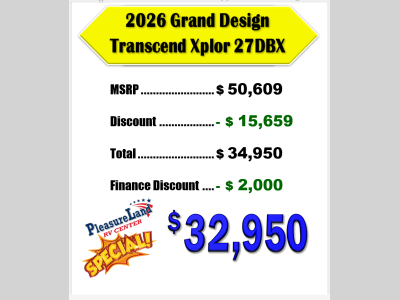 Pleasureland RV is not responsible for any misprints, typos, or errors found in our website pages. Any price listed excludes sales tax, registration tags, and delivery fees. Manufacturer pictures, specifications, and features may be used in place of actual units on our lot. Please contact us @800-862-8603 for availability as our inventory changes rapidly. All calculated payments are an estimate only and do not constitute a commitment that financing or a specific interest rate or term is available.