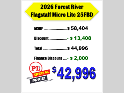 Pleasureland RV is not responsible for any misprints, typos, or errors found in our website pages. Any price listed excludes sales tax, registration tags, and delivery fees. Manufacturer pictures, specifications, and features may be used in place of actual units on our lot. Please contact us @800-862-8603 for availability as our inventory changes rapidly. All calculated payments are an estimate only and do not constitute a commitment that financing or a specific interest rate or term is available.