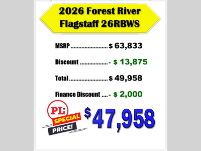 Pleasureland RV is not responsible for any misprints, typos, or errors found in our website pages. Any price listed excludes sales tax, registration tags, and delivery fees. Manufacturer pictures, specifications, and features may be used in place of actual units on our lot. Please contact us @800-862-8603 for availability as our inventory changes rapidly. All calculated payments are an estimate only and do not constitute a commitment that financing or a specific interest rate or term is available.