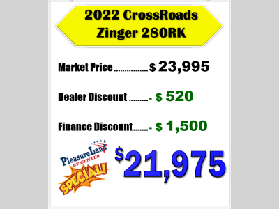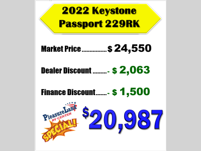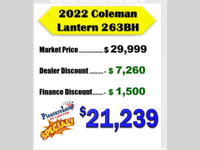 Pleasureland RV is not responsible for any misprints, typos, or errors found in our website pages. Any price listed excludes sales tax, registration tags, and delivery fees. Manufacturer pictures, specifications, and features may be used in place of actual units on our lot. Please contact us @800-862-8603 for availability as our inventory changes rapidly. All calculated payments are an estimate only and do not constitute a commitment that financing or a specific interest rate or term is available.