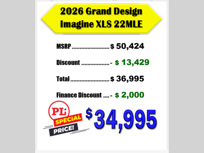Pleasureland RV is not responsible for any misprints, typos, or errors found in our website pages. Any price listed excludes sales tax, registration tags, and delivery fees. Manufacturer pictures, specifications, and features may be used in place of actual units on our lot. Please contact us @800-862-8603 for availability as our inventory changes rapidly. All calculated payments are an estimate only and do not constitute a commitment that financing or a specific interest rate or term is available.