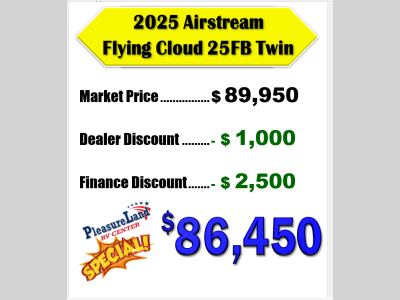 Pleasureland RV is not responsible for any misprints, typos, or errors found in our website pages. Any price listed excludes sales tax, registration tags, and delivery fees. Manufacturer pictures, specifications, and features may be used in place of actual units on our lot. Please contact us @800-862-8603 for availability as our inventory changes rapidly. All calculated payments are an estimate only and do not constitute a commitment that financing or a specific interest rate or term is available.