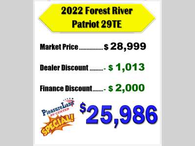 Pleasureland RV is not responsible for any misprints, typos, or errors found in our website pages. Any price listed excludes sales tax, registration tags, and delivery fees. Manufacturer pictures, specifications, and features may be used in place of actual units on our lot. Please contact us @800-862-8603 for availability as our inventory changes rapidly. All calculated payments are an estimate only and do not constitute a commitment that financing or a specific interest rate or term is available.